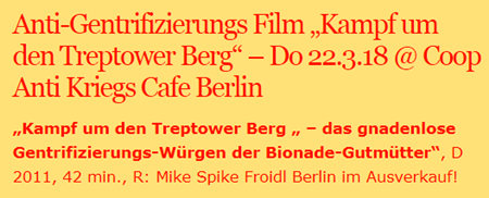 ![]() „Kampf um den Treptower Berg „ – das gnadenlose Gentrifizierungs-Würgen der Bionade-Gutmütter“, D 2011, 42 min., R: Mike Spike Froidl Berlin im Ausverkauf! ![]() Anhand zweier junger gescheiterter Künstlerinnen, die auf eine kommerzielle Yoga + Selbst-Optimierungs Oase umsatteln und die angestammten Hausbewohner vertreiben, wird in das gierige Herzchen der Gentrifizierung geschaut. Kapitalistisches Hauen und Stechen unter der Fassade der Gutheit. Dann kommt der Großinvestor. Mike Spike Froidl’s (bekannt aus Filmen wie “Nie wieder Arbeit“, “Luther fuck off“) Anti-Gentrifizierungs Film „Kampf um den Treptower Berg“ Als Vorfilm: 20 Jahre Köpi Fight Club Donnerstag 22. März 2018 um 20 Uhr Coop Anti Kriegs Cafe, Rochstr.3, Nähe Alex, http://www.coopcafeberlin.de U-Bahn Weinmeisterstr/Alexanderplatz S-Bahn Hackescher Markt/Alexanderplatz Immer mit Ausstellung von Mike Spike Froidl, Linolschnitten und Kalligrafien und Reprints seiner besten Werke http://www.mike-spike-froidl.de http://www.de.wikipedia.org/wiki/Mike_Spike_Froidl COOP ANTI-WAR CAFE BERLIN ![]() |