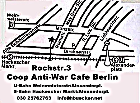 auf 2017 von und mit Jane Zahn. Donnerstag, den 25. Januar 2018 um 20 Uhr Kein Eintritt, aber ein Hut geht herum! Was war das für ein Jahr! Bundestagswahlen, Jamaika-Verhandlungen, SPD als neue Opposition, Kreisreformstopp in Brandenburg, Klimakonferenz und weltweite Kriege, Brexit und jede Menge Unabhängigkeitserklärungen von Katalonien bis Klein-Russland – kommen wir da überhaupt noch mit? Na klar, wenn Klofrau Rosa mit ihrer Reichstags-Klobürste den Problemen zu Leibe rückt und der Frau Zahn mal so richtig zeigt, wo das Klopapier hängt. Ob allerdings die Erde noch lange Zeit hat,die Unfähigkeit der Menschen zu ertragen, das kann wohl nicht abschließend geklärt werden. Kabarett mit Witz und Wut, pointierten Texten und mitreißenden Liedern, das ist der Jahresrückblick von und mit Jane Zahn. Seit 2008 wird spielerisch dem vergangenen Jahr der Spiegel vorgehalten – und die Wünsche für das nächste formuliert und abgestimmt. Was so alles bewegte und bewegt wurde in diesem Jahr wird hier satirisch aufbereitet, mit Liedern garniert und mit Ironie gepfeffert. Und auch der Spieltrieb des Publikums kommt nicht zu kurz: Sie können mitwirken bei „Wer wird nicht Millionär“ und beim „Doktorspiel“, bei dem es um richtiges Zitieren geht. Doktortitel sind allerdings nicht zu gewinnen, dafür Schokoladen-Euro – das ist reeller! Jane Zahn ist Kabarettistin, Liedermacherin und Sängern. Sie lebt seit 2014 in Rheinsberg, wo sie ihre eigene Kleinkunstbühne betreibt. Webseite: www.janezahn.de COOP ANTI-WAR CAFE BERLIN ![]() |