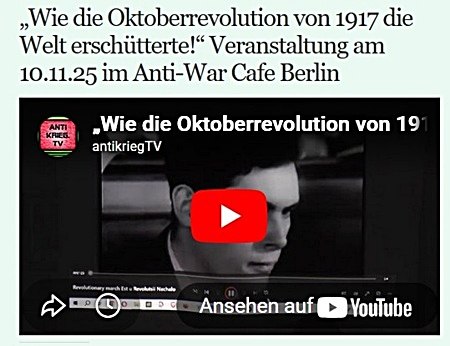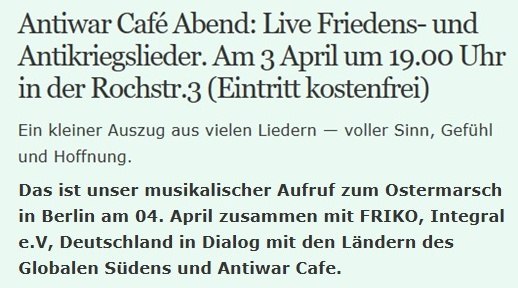 Coop Anti-War Café Kunst-Bar downtown Berlin (Alexanderplatz/Hackescher Markt) Rochstr.3 10178 Berlin (open 2005) Ab dem 1. Juli 2025 wird das Anti-War Café betrieben vom Verein: "Deutschland im Dialog mit den Staaten des Globalen Südens e.V." From July 1, 2025, the Anti-War Café will be run by the association: “Germany in Dialogue with the Countries of the Global South e.V.” Auf Grund der hohen Mietkosten und sozialer Preise sind wir auf Spenden angewiesen. Due to high rental costs and social prices, we are dependent on donations: Verein "Deutschland im Dialog mit den Staaten des Globalen Südens e.V." Konto Berliner Volksbank: DE06 1009 0000 3056 3640 04 geöffnet ab 18 Uhr bis nach Mitternacht - täglich ausser Sonntag open from 6 PM to after midnight - daily except Sundays abierto de 6 p.m. a pasada la medianoche, todos los días excepto los domingos LINK ![]() LINK LINK![]() Unsere liebe Freundin Telma ist am 12. Februar 2026 von uns gegangen. LINK ![]() LINK ![]() LINK ![]() ![]() Gedenk- und Kulturveranstaltung in Berlin von Integral e.V. im Anti-War Cafe , Rochstr. 3 ![]() LINK Di 3. Feb um 18 Uhr HÄNDE WEG VON VENEZUELA Vor der US-Botschaft am Brandenburger Tor / Pariser Platz Internationaler Protesttag Gegen die US-Interventionen in Lateinamerika und in der Karibik! Freiheit für Präsident Maduro und Cilia Flores! LINK ![]() LINK ![]() Sa 3. Januar Protestkundgebung gegen US-Angriff auf Venezuela in Berlin Pariser Platz vor der US-Botschaft Mit Reden von Nancy Larenas, Gesine Lötzsch, Sevim Dagdelen u.a.m. LINK Angriff auf Venezuela Di 13.Jan. 2026 um 19 Uhr Aktionstreffen Coop Anti-War Cafe Mo 5.Jan. 2026 Mo 8.Dez. 2026 Aktionstreffen Coop Anti-War Cafe Sa 6.Dezember: Kundgebung vor der US-Botschaft am Brandenburger Tor / Pariser Platz VIDEOS ![]() LINK ![]() LINK ZUM ARTIKEL HIER LINKGina Pietsch: Nicht mehr auffindbar nach dem Dritten Ein Antikriegsabend @ Anti-War Café – Mo 29.9. LINK„KRIEG ich FRIEDEN?“ Kabarettistische Friedenserklärung gegen Kriegstüchtigkeit von und mit Jane Zahn - Fr. 19. Sept. ab 20 Uhr im Anti-War Kunst Cafe Berlin ![]() Eine bitterböse Satire-Kanonade zum Zeitgeschehen mit Texten und Songs von Jane Zahn. Politisches Kabarett ohne Politiker - aber mit zwerchfellerschütternden Denkanstößen und entwaffnenden Seitenhieben. Jane Zahn zieht alle Register ihres kämpferischen Könnens, um mit Lachsalven und Bombenstimmung mobil zu machen gegen kriegerische Zeiten. Ob Liedermacher-like, blues-röhrend, a-capella oder rappend: Pointiert wie die Texte ist auch die vielseitige musikalische Gestaltung des Programms. Die immer wieder verblüffende Verwandlungsfähigkeit ihrer Stimme und Mimik nutzt Jane Zahn zur Freude der Zuschauer scheinbar grenzenlos aus. Das ist kabarettistische Vorwärtsverteidigung ohne Hin-du-kusch! Ein Survival-Paket für Zeit-Geschädigte, ein Erste-Hilfe-Kasten für Medien-Opfer und ein Angriff auf verhärtete Denkmuster und verkümmerte Lachmuskeln. HIER LINK ![]() LINK ![]() Sa.13.9. Kundgebung Brandenburger Tor Frente Unido América Latina Solidarität mit Venezuela, mit Lateinamerika, dem Globalen Süden und der Idee einer multipolaren Welt. Frieden mit China und Russland! Sa 6. Sept. 2025 - von 14-16.30 Pariser Platz / Brandenburger Tor / US-Botschaft VIDEOS LINKVIDEOS LINKFrente Unido América Latina Solidarität mit Venezuela, mit Lateinamerika, dem Globalen Süden und der Idee einer multipolaren Welt. Frieden mit China und Russland! Kundgebung am Samstag 2.August 2025 Pariser Platz / Brandenburger Tor / US-Botschaft haendewegvonvenezuela.net VIDEOS Portrait Jewgeni Wutschetitsch, Bildhauer und Erbauer des Treptower Ehrenmals und vieler weltbekannter Denkmale, z.B. auch „Schwerter zu Pflugscharen“ vor dem Uno Hauptgebäude in New York. Sein Motiv: Nikolai I. Massalow: „Dich wollte ich tragen und trösten“. gemalt von Bärbel Brede ![]() 7.August 2025 um 19 Uhr Hiroshima und Nagasaki 1945 LINK WBW Events![]() VIDEOS LINK LINK LINK22. Juni 2025 - Gedenken an das sogenannte "Unternehmen Barbarossa" den Angriff der faschistischen deutschen Wehrmacht auf die UdSSR - Sowjetisches Ehrenmal im Treptower Park - Beginn um 4 Uhr morgens. Kundgebung der Berliner Friedenkordination (Friko) zusammen mit iranischen Friedensfreunden am Di, den 24.6. um 18 Uhr vor dem Bundeskanzleramt LINK LINK20. Mai 2025 - Gedenktag an Augusto Nicolas Sandino @ Coop Anti-War Café Kunst-Bar LINKTrio Quijote – Notstand Frieden @ Anti-War Café-Bar am 3. Mai 2025 LINK LINK LINK![]() ![]() LINKFreitag, den 4. April um 20 Uhr LINK LINK LINKSa 22.3. : Lesung Wladimir Majakowski – von Oliver Berg & Therenin @ Antiwarcafe Fr 7.3.-18.4.2025 – Ausstellung mit Bildern von Bärbel Brede Kriegstüchtig? Friedenstüchtig! @ Anti-War Café Berlin LINK![]() LINKDie Enkelin von Karl Liebknecht, Marianne Liebknecht zu Besuch im Coop Anti-War Café Berlin: „Die Ermordung meines Großvaters war eine Tragödie für die Welt … Weil er einen weiteren Krieg verhindern wollte“ Marianne Liebknecht war am Vorabend der LL-Konferenz zu Gast im Coop Anti-War Café Berlin. Sie ist die Enkelin des am 15. Januar 1919 durch den Verrat des SPD-Kriegsministers Gustav Noske von Freikorpsschergen ermordeten Rechtsanwalts, Revolutionärs und Mitbegründers der Kommunistischen Partei, Karl Liebknecht. LINK„Ein brüchiges Lager gegen den Imperialismus? Von Niger, über den Donbass nach Gaza“ Diskussionsveranstaltung Fr 10.1.2025 Haus der Demokratie (kommunistische-organisation.de) LINK Sa 11. Januar: Internationale Rosa-Luxemburg-Konferenz »Kriegstüchtig? Nie wieder! Wie stoppen wir die Aufrüstung in Deutschland?« LINK So 12. Januar: Luxemburg-Liebknecht Demonstration Für Internationalismus und Solidarität mit allen Unterdrückten LINK ![]() Am 12.Dezember 2024 um 19 Uhr fand eine Veranstaltung zum Thema Stepan Bandera und Faschismus in der Ukraine statt. LINK Am Do. 11 November 2024 um 9 Uhr Gegen Alexandra Veber fand im Amtsgericht Tiergarten (