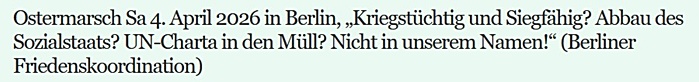 LINK10 Jahre nach dem Progrom. Zum Gedenken an den 2. Mai 2024 in Odessa Kundgebung: Bündnis Odessa-Kein-Vergessen 2.Mai 2024 um 18.30 ![]() 4.Mai @ Coop Anti-War Cafe Remember Odessa, von W. Domke-Schulz Film & Diskussion (Veranstalter Kommunistische Organisation) ![]() ![]() Fr. 3. Mai 2024 ab 19 Uhr @ Coop Anti-War Cafe LINK26. Jan 2024: Coop Anti-War-Café Berlin ![]() LINK HIER Donnerstag 25. Jan 2024 um 19 Uhr: DEFA Spielfilm „Trotz alledem!“ ein Film über Karl Liebknecht – KINTOPP im Keller / COOP Anti-War-Cafè Berlin, Rochstr.3 (Nähe Alex) LINK ---------------------------------------------------------------------------------------------------------------------------- LINK![]() Donnerstag 30. November 2023 um 19 Uhr ![]() Sa 28.10.2023 - 14.00 Uhr ![]() Kundgebung am 4.11.2023 ---------------------------------------------------------------------------------------------------------------------------- Coop Anti-War-Café Berlin Di, 10 Oktober um 19 Uhr Filmvorführung anlässlich des Gründungstages der DDR Veranstalter: DKP Gruppe LINK LINK----------------------------------------------------------------------------------------------------------------------------- ![]() Kommunistische-Organisation LINK ---------------------------------------------------------------------------------- LINK----------------------------------------------------------------------------------------------------------------------------- Coop Anti-War Cafe Berlin – Fri, 8 September 2023 at 7 PM „What’s Wrong with the United States?: Trump, the Democrats and Russia“ by George V Wright, Prof. em. Department of Political Science California State University, Chico LINK ![]() ![]() Stopp den Krieg in der Ukraine Hunderttausende Soldaten sind in diesem Krieg gestorben. Sanktionen, die Russland schaden sollten, haben weltweit zu wirtschaftlicher Instabilität geführt. Hunderte Milliarden Dollar wurden an die US-Rüstungsindustrie und die Ukraine gespendet, um diesen Krieg zu führen. Es ist an der Zeit, eine Bewegung aufzubauen, um den Krieg zu stoppen. Beenden Sie den Krieg in der Ukraine! Nein zur NATO! Keine Waffen, kein Geld für den Krieg! Internationale Aktionen LINK Internationale Unterschriftenkampagne für Kuba und gegen die US-Blockade. ![]() Jetzt wurde eine Unterschriftenkampagne gegen die US-Blockade ins Leben gerufen. Sie wird von zahlreichen Künstlern, Intellektuellen, politischen Führungspersönlichkeiten, Gewerkschaften, sozialen Organisationen und politischen Parteien getragen und fordert von US-Präsident Joe Biden, Kuba umgehend von der US-Liste der "staatlichen Sponsoren von Terrorismus" zu streichen. Hier unterzeichnen: https://www.letcubalive.info Der Ché wird 95 – Wir feiern am 16. Juni 2023 ab 19.00 Uhr Coop Anti-Kriegs Café Berlin Vor 95 Jahren erblickte Ernesto Ché Guevara, besser bekannt als Ché das Licht der Welt. Diesen 95. Geburtstag des Arztes, Revolutionärs, heldenhaften Guerillakämpfers, Internationalisten und antiimperialistischen Kämpfer wollen wir gemeinsam begehen. Sein antiimperialistisches Vermächtnis ist heute wichtiger denn je. „Seit immer fähig, jede Ungerechtigkeit, die sich gegen irgendjemandem, in jeglichen Teil der Welt richtet, in eurem innersten zu spüren. Das ist die schönste Eigenschaft eines Revolutionärs.“ ![]() ![]() LINK LINK LINKAls sich US- und sowjetische Truppen als Freunde trafen (World Beyond War) LINK LINK LINK![]() LINK LINK LINK LINKAlle weiteren Presseberichte Hier LINKim Rahmen unserer Kundgebung von Frente Unido América Latina nehmen wir an der Martin Luther King Aktionswoche teil. Nein zur NATO! Schluss mit den Provokationen gegen Russland und China! Und mit den endlosen Kriegen: Irak, Syrien, Somalia, Palästina…. überall. LINK LINK![]() Neuster Sabotageakt in einer ganzen Reihe von Aktionen gegen das Coop Anti-War Café Berlin – Meinungsfreiheit? LINK ![]() Oliver-Stone - Ukraine in Flammen - Ukraine on Fire - English / Deutsch LINK ![]() Samstag, 5. November Pariser Platz / Brandenburger Tor von 14 bis 16.30 Uhr LINK am 14. Januar Rosa-Luxemburg Konferenz LINK LINK LINK LINK LINK LINK LINKHeute vor 81 Jahren, am 22. Juni 1941 begann das "Unternehmen Barbarossa" Der Angriff der faschistischen deutschen Wehrmacht gegen die Sowjetunion 22. Juni 1941 - Wir vergessen nicht! ![]() VIDEOS DER KUNDGEBUNG LINK Kundgebung am 22. Juni 2022 um 18:00 Uhr am Sowjetischen Ehrenmal im Treptower Park Reden von: Hans Bauer, Gesellschaft zur rechtlichen und humanitären Unterstützung (GRH) Heiner Bücker, Coop Anti-War Café Anja Mewes, Vorsitzende der Friedensglockengesellschaft e.V. Gina Pietsch unterstützt mit einem kleinen Programm unserem Anliegen. ![]() Bitte unterstützen: Brief aus Berlin An die russischen Veteranen, an die Bevölkerung und die Regierung der Russischen Föderation. Bitte unterstützen: Stellungnahme zum Krieg in der Ukraine Please support: Statement on the war in Ukraine BITTE UNTERZEICHNEN UND WEITERVERBREITEN Nachrichten hier und auf unserem Newsblog: https://cooptv.wordpress.com art, books, music, films, gallery in the basement Kunst, Bücher, Musik und Filme, Ausstellungen, Veranstaltungen in der Kellergalerie Documentaries - News - Meetings - Art Shows Alternative Medien - Treffpunkt - Information since 2005 MAP Rochstr.3 Berlin-Mitte (Alex) U-Bahn Weinmeisterstr./Alexanderplatz S-Bahn Hackescher Markt/Alexanderplatz Appell für eine zügige weltweite Zulassung für russische, chinesische und kubanische Impfstoffe und Medikamente zur Bekämpfung von Covid-19. Für internationale Zusammenarbeit und Solidarität! ![]() DEUTSCH ENGLISH ![]() Am Samstag, den 2. Juli nahmen wir an der Demonstration teil Bilder: https://bit.ly/3cHYImw LINKMontag, den 27. Juni ab 19 Uhr #aufstehen S-Bahn-Film-Aktion Folgetreff für Interessierte (Coop Anti-War Cafe) Rochstr.3, Berlin-Mitte LINK ![]() Atomwaffen sind jetzt illegal - in Europa, in Deutschland und weltweit - Europäisches Regionaltreffen des Weltfri